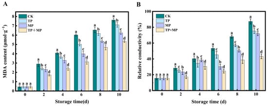 As shown in Figure 5B, the relative conductivity of all groups increased throughout the storage period. However, the treated groups (TP, MP, and TP + MP) exhibited a significantly slower increase in relative conductivity compared to the CK group. After 10 days, the TP + MP group recorded the highest relative conductivity at 87.36%, while the CK group showed the lowest value at 43.25%. Additionally, a statistically significant difference (p < 0.05) was observed between the TP + MP group and the other groups.