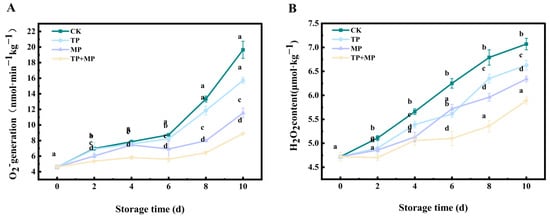 Throughout the storage period, the O2·− generation rate increased in all groups (Figure 6A), with the CK group consistently exhibiting the highest levels. Notably, after 10 days of storage, the TP + MP group demonstrated a significantly lower O2− generation rate compared to the other treatments (p < 0.05). Similarly, the H2O2 content steadily increased over time (Figure 6B). After 10 days, it was evident that the TP, MP, and TP + MP treatments effectively minimized the accumulation of reactive oxygen species (ROS) in comparison to the CK group.