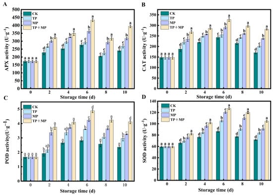 As illustrated in Figure 7A, the APX activity in all groups initially increased and then gradually declined over the storage period. Peak APX activity was reached on day 6 in all groups, with the TP + MP group showing significantly higher activity (433.93 U·g−1) compared to the other treatments (p < 0.05). After 10 days of storage, APX activity remained elevated in the CK, TP, MP, and TP + MP groups to varying extents. Among these, the TP + MP group recorded the highest APX activity at 393.93 U·g−1.