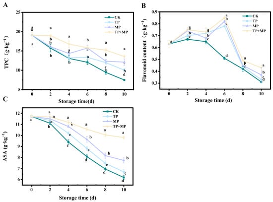 As can be seen in Figure 8B, the flavonoid content in each treatment initially increased, followed by a gradual decline. The peak flavonoid content occurred on day 6 for all groups, with the TP + MP group maintaining the highest level at 0.85 g·kg−1. In comparison, the flavonoid contents of the TP, MP, and CK treatments were 0.78 g·kg−1, 0.82 g·kg−1, and 0.51 g·kg−1, respectively. Notably, after 10 days of storage, the TP + MP group continued to exhibit the highest flavonoid content, significantly outperforming the other treatments.