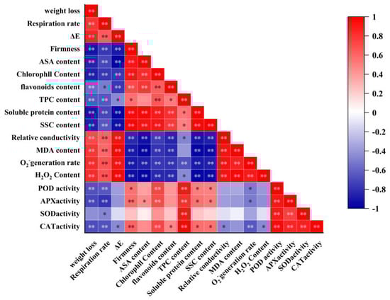 The Pearson’s correlation analysis shown in Figure 9 reveals both positive and negative correlations between the different parameters assessed in this study. Weight loss was significantly and positively correlated with MDA, H2O2 content, O2− generation rate, respiration rate, relative conductivity, and ΔE (p < 0.01). Additionally, hardness, chlorophyll content, SSC, soluble protein, and TPC were positively correlated with antioxidant enzyme activities (POD, SOD, APX, and CAT), and negatively correlated with ΔE, MDA, H2O2 content, and O2− generation rate. Furthermore, hardness, ASA, SSC, and soluble protein content were significantly and positively correlated with antioxidant enzymes (POD, CAT, and APX) (p < 0.05). In conclusion, the senescence of leaf-vegetable sweet potatoes during storage is driven by elevated ROS levels, which lead to a decline in overall quality.