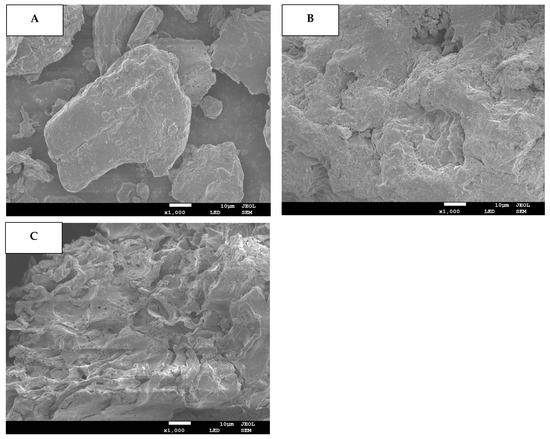 The DF samples’ microstructural attributes were assessed through SEM and results are provided for blueberry residue (Figure 1A) as well as blueberry residue DF fractions extracted by C (C-DF: Figure 1B) and WB (WB-DF: Figure 1C). When compared with WB-DF and C-DF, the blueberry residue had a dense texture and smooth surface with no existence of pores. However, the C-DF (Figure 1B) and WB-DF (Figure 1C) had surface irregularity in conjunction with microstructural damage, enhanced pore loosening, and degradation of cell walls. In the case of plant cell walls, the microfibrils play a vital role in making up the structural framework constituents of cell walls, such as lignin, cellulose, and hemicellulose [30,31]. Both lignin and hemicellulose play contributory roles as binder and filler between these microfibrils. The cracks and fissures were also visible on the surfaces of treated C-DF and WB-DF blueberry residue DF fractions. WB-DF fraction exhibited an increased presence of pore loosening, surface irregularities, fissures and cracks, microstructure impairment, and cell wall disintegration compared to DF fraction obtained by C-DF. In contrast to C-DF, the rising tendency of porosity in the case of the WB-DF structure might be attributable to the shearing and collisions owing to WB treatment, which was in agreement with the previously reported finding of Ma and Mu [31]. Figure 1C also depicted the WB treatment, which caused significant enlargement in surface area of DF as compared to that of C treatment, hence, resulting in enhanced binding and water absorption. Conclusively, WB-DF exhibited the maximum alteration in the apparent structure of DF as compared to that of C-DF and blueberry residue. WB treatment increased the degree of formation of cavities in WB-DF, thereby resulting in enhanced specific area and improved physicochemical and functional characteristics.