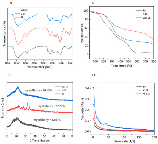 FT-IR spectra (A), thermal properties (B), X-ray diffraction (C), and rheogram plot (D) for BR, C-DF, and WB-DF. BR: blueberry residue; C-DF: cross-linked dietary fiber of blueberry residue; WB-DF: wet ball-milled dietary fiber of blueberry residue.