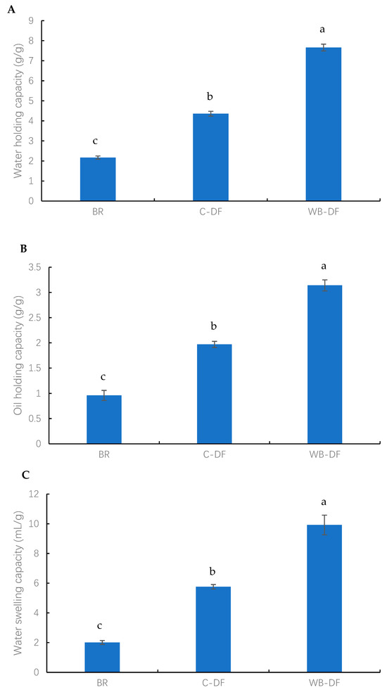 (A) water holding capacity (B) oil holding capacity (C) water swelling capacity of BR, C-DF, and WB-DF; BR: blueberry residue; C-DF: cross-linked dietary fiber of blueberry; WB-DF: wet ball-milled dietary fiber of blueberry residue. Different letters above the bars indicate significant differences between the mean values (p ≤ 0.05).