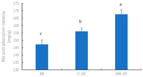 Bile acid adsorption capacity of BR, C-DF, and WB-DF. BR: blueberry residue; C-DF: cross-linked dietary fiber of blueberry residue; WB-DF: wet ball-milled dietary fiber of blueberry residue. Different letters above the bars indicate significant differences between the mean values (p ≤ 0.05).