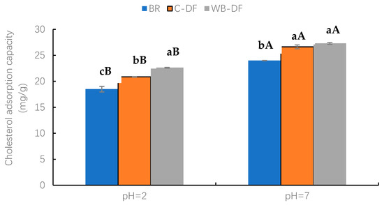 Cholesterol adsorption capacity of BR, C-DF, and WB-DF. BR: blueberry residue; C-DF: cross-linked dietary fiber of blueberry residue; WB-DF: wet ball-milled dietary fiber of blueberry residue. Means with different lowercase letters (a–c) above each group of bars (within the same group) indicate significant differences (p ≤ 0.05). Means with different uppercase letters (A–B) above each type of treatment (between groups) are significantly different (p ≤ 0.05).