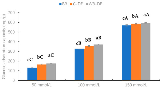 Glucose adsorption capacity of BR, C-DF, and WB-DF. BR: blueberry residue; C-DF: cross-linked dietary fiber of blueberry residue; WB-DF: wet ball-milled dietary fiber of blueberry residue. Means with different lowercase letters (a–c) above each group of bars (within the same group) indicate significant differences (p ≤ 0.05). Means with different uppercase letters (A–C) above each type of treatment (between groups) are significantly different (p ≤ 0.05).