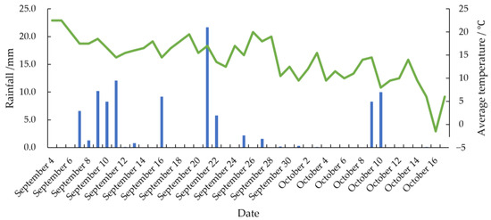 The experiment was conducted at the maize and soybean experimental base in Gongzhuling City, Changchun City, Jilin Province (longitude: 124.82°, latitude: 43.53°, altitude: 214 m). The experimental sampling period for maize and soybean spanned from 4 September 2021, to 17 October 2021, covering part of the grain filling period through to the full maturity period. A combination of organic and inorganic fertilizers was applied as basal fertilizer. Integrated pest management (IPM) was implemented, combining agricultural and chemical control strategies. The first pesticide application on 1 July 2021 included 40% Syringa tebuconazole (40 mL/666.7 m2) and 20% chlorantraniliprole (5 mL/666.7 m2). The second application on 29 July 2021 used 30% boscalid and fludioxonil (40 mL/666.7 m2) and 40% chlorantraniliprole and thiamethoxam (8 g/666.7 m2). The temperature and amount of rainfall during the experiment are shown in the Figure 1.