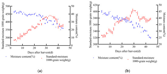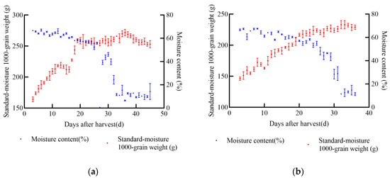 In 2021, the experiment was conducted in Gongzhuling City, Changchun City, Jilin Province. The selected maize varieties were XY335, FM985, JD31, and KX3564. Uniform and fully matured grains from the middle of each ear were selected for the experiment. Two indexes, namely 1000-grain weight and moisture content, were determined, and a standard moisture 1000-grain weight model was established. During the wax-ripening stage of maize, dry matter accumulation reaches its peak, after which it either stabilizes or declines, indicating latent loss, as shown in Figure 2. The changing trends of standard moisture 1000-grain weight and moisture content varied across the four varieties.