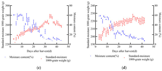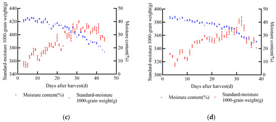 Relationship between standard moisture 1000-grain weight, moisture content, and post-harvest days of maize in 2021, (a) JD31, (b) FM985, (c) XY335, (d) KX3564.