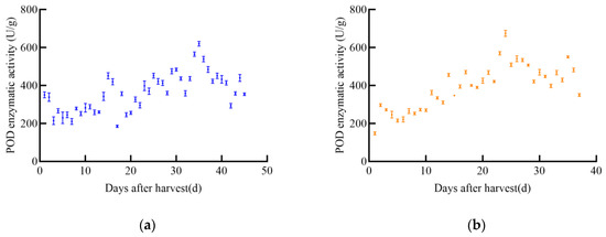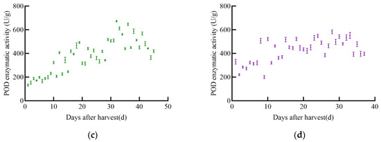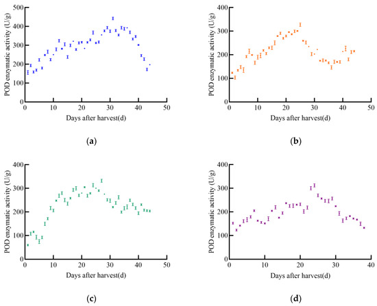 With the increase in post-harvest time, the overall trend of POD enzyme activity in different maize varieties initially increased and then decreased, as shown in Figure 4. The POD enzyme activity of JD31 increased slowly, reaching a maximum value of 442.2 U/g on day 31, after which it declined rapidly. The POD enzyme activity of FM985 increased almost linearly, reaching a maximum value of 327.3 U/g on day 25, then gradually decreased but increased again on day 40. The POD enzyme activity of XY335 showed a steady increase, reaching a maximum value of 332.2 U/g on day 27, followed by a slow decrease. The POD enzyme activity of KX3564 increased with post-harvest time but fluctuated significantly, reaching a maximum value of 312.2 U/g on day 24, and then decreased slowly.