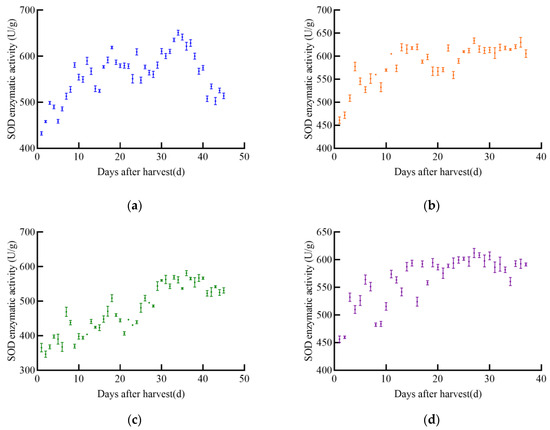 As shown in Figure 7, the SOD enzyme activity of soybeans changes with the increase in harvest time, and the trends vary significantly among the four varieties. The SOD enzyme activity of JY52 shows an upward–downward–upward trend, reaching a maximum value of 651.2 U/g on the 34th day and then gradually decreasing. The overall trend of SOD enzyme activity in JL16 is a rapid increase followed by a slow increase, reaching a maximum value of 633.7 U/g on the 27th day. The trend of SOD enzyme activity in JY47 is similar to that of JL16, showing a gradual increase with significant fluctuations, reaching a stable upward phase around the 30th day, with a peak value of 581.1 U/g on the 36th day. The SOD enzyme activity of JL8 first increases with little fluctuation, maintaining a stable range around 20 days after harvest, with a maximum value of 612.3 U/g.
