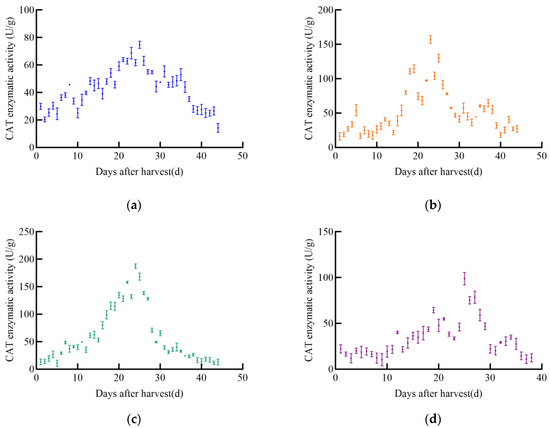 With the increase in post-harvest time, the catalase (CAT) enzyme activity of different maize varieties exhibited significant changes, generally following an initial increase followed by a decrease, as illustrated in Figure 8. The CAT enzyme activity of JD31 peaked at 74.7 U/g on the 25th day and then gradually declined. Similarly, FM985 reached its maximum CAT activity of 157.2 U/g on the 23rd day before gradually decreasing. The CAT enzyme activity of XY335 initially increased linearly, peaking at 187.4 U/g on the 24th day, after which it gradually declined. In contrast, KX3564 showed an insignificant increase in CAT activity, reaching a maximum of 98.9 U/g on the 25th day before decreasing.