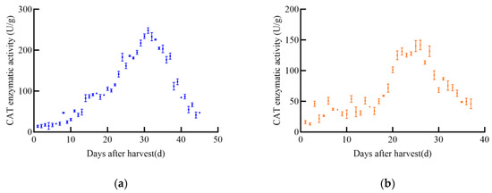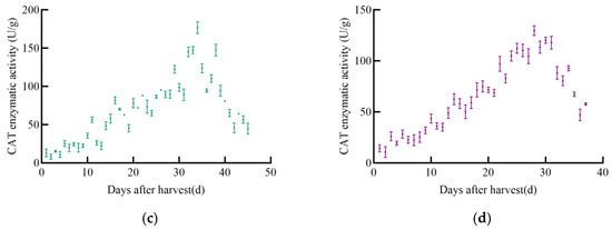 As shown in Figure 9, CAT enzyme activity in soybeans also changed significantly with increasing post-harvest time, following a general trend of increase followed by decrease. The CAT enzyme activity of JY52 increased to a maximum of 248.1 U/g on the 31st before declining. JL16’s CAT activity increased and then stabilized for a period before rapidly increasing to a peak of 141.9 U/g on the 26th, followed by a decline. Both JY47 and JL8 exhibited similar trends, with a slow increase in CAT activity followed by a rapid decrease. JY47 reached a maximum CAT activity of 177.0 U/g on the 34th day, while JL8 peaked at 129.7 U/g on the 28th.