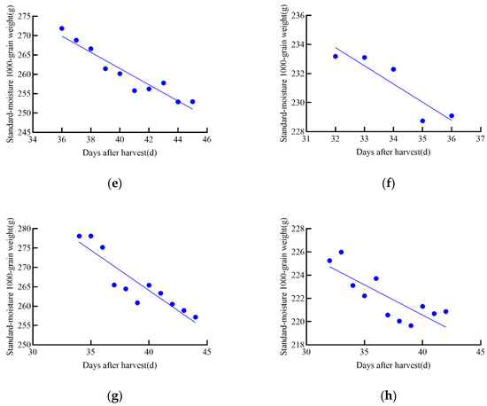 To analyze the relationship between standard moisture 1000-grain weight and post-harvest time, both linear and nonlinear regressions were performed using the obtained data. To identify the best model for each relationship, first-order and second-order models were constructed, and the model with the highest R2 value was selected. The best harvest date was then chosen as the reference point, and a linear regression equation was established between the standard moisture content of 1000 grains weight (g) and the days after harvest (days), as shown in Table 3. The best harvest date corresponds to the day when the dry matter weight of the grain reaches its maximum during growth.