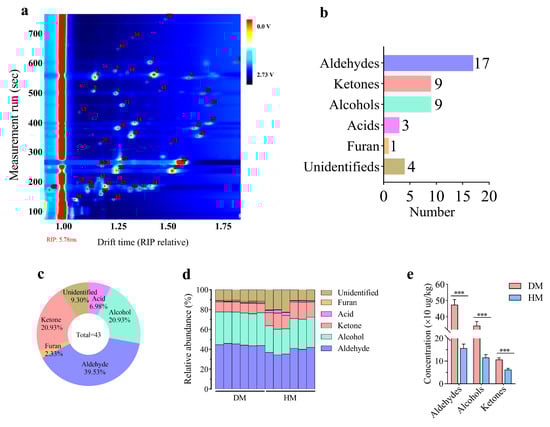 As shown in Figure 1 and Table 1, a total of 43 VOCs (17 aldehydes, 9 ketones, 9 alcohols, 3 acids, 1 furan, and 4 unidentified) were detected in DM and HM, including 39.53% aldehydes, 20.93% ketones, 20.93% alcohols, 6.98% acids, 2.33% furans, and 9.30% unidentified. Among them, 39 VOCs were identified in both DM and HM (Figure 1a–c). Aldehydes, alcohols, and ketones were the main categories of VOCs in both DM and HM (Figure 1d). Notably, the concentrations of aldehydes, alcohols, and ketones in DM were significantly higher than those in HM (p < 0.001; Figure 1e).