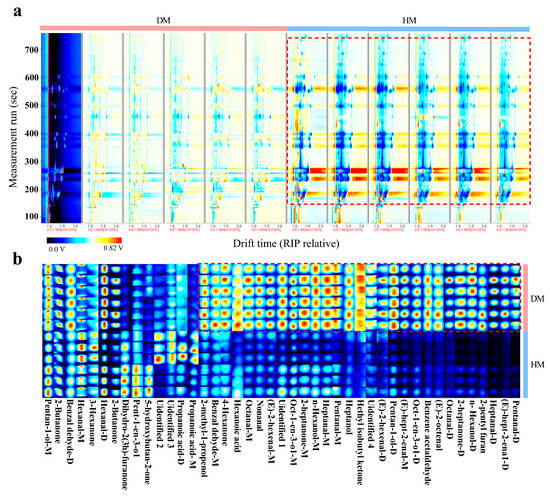 As shown in Figure 3, significant differences in fingerprint features between DM and HM can be observed (Figure 3a). Moreover, several compounds, including pentanal, (E)-hept-2-enal, heptanal, 2-pentyl furan, n-hexanol, 2-heptanone, octanal, (E)-2-octenal, benzene acetaldehyde, oct-1-en-3-ol, pentan-1-ol, (E)-2-hexenal, ethyl isobutyl ketone, heptanol, nonanal, hexanoic acid, 4-hexanone, benzaldehyde, and 2-methyl-1-propanol, exhibited distinct signals between DM and HM, suggesting that these compounds contribute to the differentiation of the VOC fingerprint profiles of DM and HM (Figure 3b)