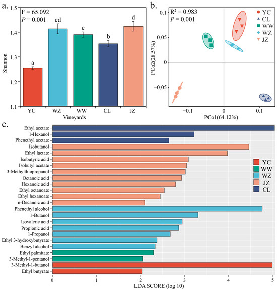 - Wei, R.; Ding, Y.; Chen, N.; Wang, L.; Gao, F.; Zhang, L.; Song, R.; Liu, Y.; Li, H.; Wang, H. Diversity and Dynamics of Microbial Communities During Spontaneous Fermentation of Cabernet Sauvignon (Vitis vinifera L.) from Different Regions of China and Their Relationship with the Volatile Components in the Wine. Food Res. Int. 2022, 156, 111372. [Google Scholar] [CrossRef] [PubMed]