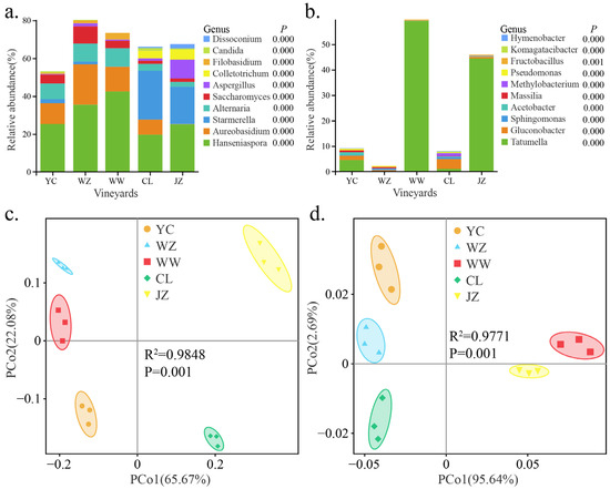 - Bokulich, N.A.; Thorngate, J.H.; Richardson, P.M.; Mills, D.A. Microbial Biogeography of Wine Grapes is Conditioned by Cultivar, Vintage, and Climate. Proc. Natl. Acad. Sci. USA 2013, 111, E139–E148. [Google Scholar] [CrossRef] [PubMed]