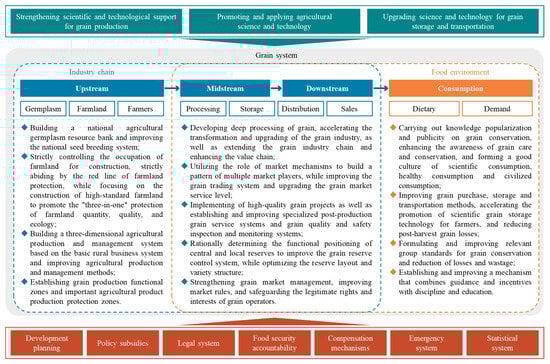 According to the basic national conditions of the primary stage of socialism and China’s huge population, ensuring grain production is the core of China’s food security strategy. Therefore, the Chinese government has identified key measures to ensure national food security from the perspective of the grain industry chain (Figure 1). For example, in the upstream, it is necessary to steadily improve grain production capacity via measures such as the construction of high-standard farmland, the development of germplasm resources, and the establishment of functional zones for grain production and protected zones for important agricultural products. In the midstream, there is a need to reasonably determine the functional positioning of central and local grain reserves, improve the reserve regulation and management mechanism, and optimize the variety structure of grain reserves. In the downstream, it is necessary to build a grain production-marketing cooperative platform and establish a synergistic promotion pattern by multiple players, thus improving the grain trading system and enhancing the service level of the grain market. In addition, the Chinese government has also identified key issues that need attention in the food environment in terms of the two dimensions of diet and demand. For instance, the government has actively launched publicity and education campaigns to raise public awareness of food conservation and established a sound mechanism combining guidance-incentives and discipline-education to reduce “waste on the table”.
