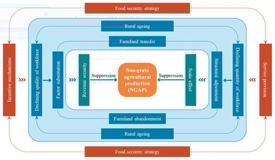 In general, the decline in both quantity and quality of the agricultural production labour force due to rural ageing will inevitably lead to such phenomena as farmland abandonment, land transfer, factor substitution and production restructuring. Under the national strategy of food security, a series of policies to support and benefit agriculture have increased the benefits from grain production through incentive mechanisms while ensuring the scale effect of grain production has been realised through service supply, thus discouraging NGAP (Figure 2).