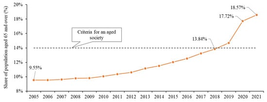 The core driver of China’s rural ageing over the past few decades has been the large-scale migration of the rural working-age population to urban areas in the course of rapid industrialisation and urbanisation [,]. As a result, rural ageing will inevitably bring about a shortage of agricultural labour, and this situation will continue to worsen as the level of ageing increases. Data from China’s fourth and seventh population censuses indicate that the ratios of rural population aged 45–54 and 55–64 increased from 8.02% and 6.55% in 1990 to 17.45% and 14.20%, respectively. It is expected that the ratio of people aged 65 and over in rural China will reach 30% by 2030, suggesting that China’s agricultural production will increasingly depend on the contributions of the elderly [,,,].
