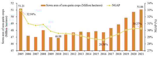 In 1998, the share of population aged 65 and over exceeded 7% for the first time in rural China [], which means that rural China was formally defined as an ageing society. Since then, China’s rural population has continued to age. In 2019, this figure exceeded 14%, marking the entry of rural China into an aged society (Figure 3). By 2021, the share of China’s rural population aged 65 and over rose from 9.55% in 2005 to 18.57%, with an average annual growth rate of 4.25%. Compared with the continuous rise in rural ageing level, the evolution of China’s NGAP is generally featured by a preliminary decline and then an increase, from 32.94% in 2005 to 28.58% in 2016 and then to 30.27% in 2021. In terms of the sown area, the sown area of non-grain crops decreased rapidly in 2005–2006, then fluctuated between 47–48 million hectares in the following decade, before steadily increasing in 2016 (Figure 4).