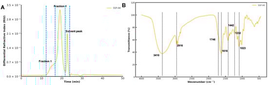 (A) Size exclusion chromatogram and (B) FT-IR spectra of SSP-AK.