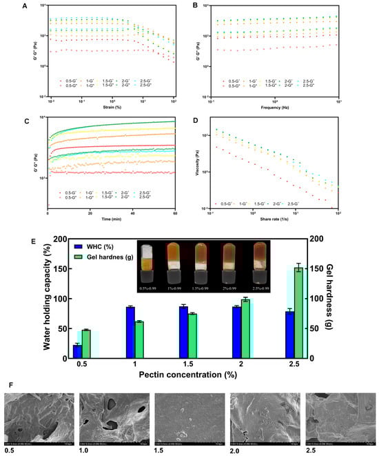 (A–D) Strain sweep, frequency sweep, time sweep, flow behaviors of SSP-AK prepared by different pectin concentrations (0.5–2.5%); (E) WHC, gel hardness and the images of SSP-AK gel samples by different pectin concentrations; (F) SEM of SSP-AK gel samples by different pectin concentrations.
