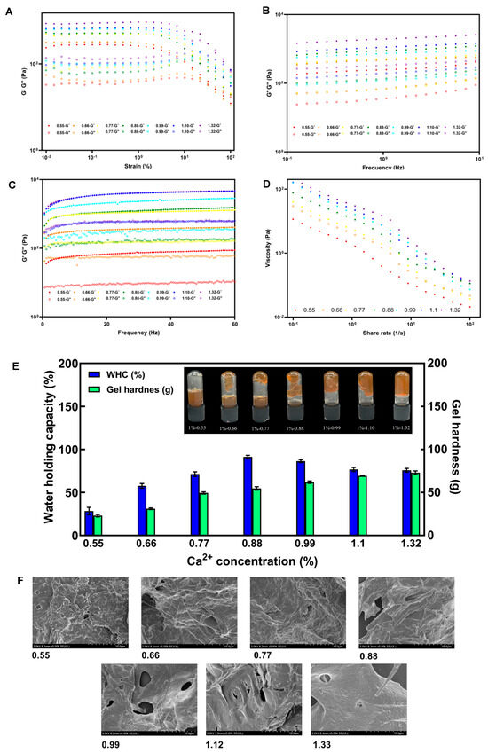 The gelling properties of SSP-AK gels induced by different Ca2+ concentrations were examined, and the results are shown in Figure 3. As expected, the addition of Ca2+ concentrations significantly affected the flow behavior of SSP-AK gels. In the strain sweep test, all gel samples had a greater G′ than G″ at low stress, indicating that all gels were in the solid phase. The gel with 0.55 mg/g Ca2+ showed the narrowest LVR, ranging from 0.01% to 1.47%, and the LVR became wider as the Ca2+ concentration increased from 0.55 to 1.32 mg/g. The widest LVR was found in gels with Ca2+ concentrations of 1.10 and 1.32 mg/g, ranging from 0.01% to 14.7%. Interestingly, the highest yield point was observed in the gel with 0.55 mg/g Ca2+, at around 47.1%, whereas the other gel samples showed lower yield points. For instance, the yield point of the gel with 0.66% and 0.88 mg/g Ca2+ was 21.6%. A similar trend, where an increase in Ca2+ concentration led to increased G′ values in gel samples, was observed in both frequency and sweep and time sweeps (Figure 3A–D). Furthermore, the gel with higher Ca2+ concentration also showed a greater apparent viscosity at the shear rate range of 0.1–100 s−1. Taken together, the addition of more Ca2+ could induce a stable gel with better flow behavior, which is consistent with previous studies showing that increasing Ca2+ concentration enhances the gel network [8,31,32].