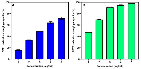 (A) DPPH radical-scavenging activity and (B) ABTS scavenging activity of SSP-AK.