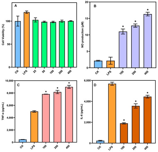 (A–D) Cell viability, NO production, TNF-α production and IL-6 production of SSP-AK. CK is the blank control group; LSP is the positive control group (lipopolysaccharide). * stands for a significant difference (p < 0.05).