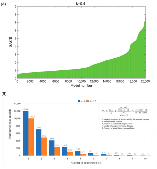 (A) The plot of SACR values for the remaining test dataset of 20,000 OCPLS models (k = 0.4); (B) the theoretical number of good models calculated based on possible numbers of adulterated oils (from 1 to 10).