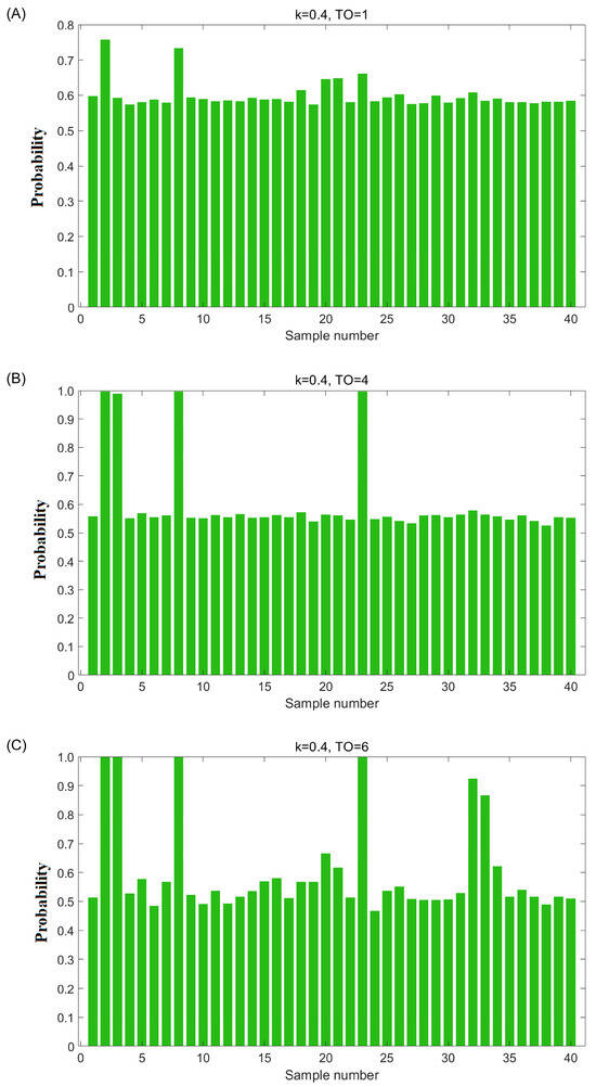 (A) The probability of 40 samples of the corresponding theoretically good models (k = 0.4, total number of outliers (TO) = 1); (B) the probability of 40 samples of the corresponding theoretically good models (k = 0.4, TO = 4); (C) the probability of 40 samples of the corresponding theoretically good models (k = 0.4, TO = 6).