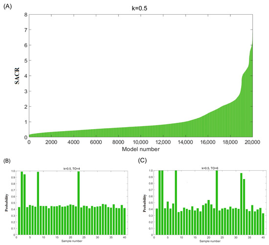 (A) The plot of SACR values for the remaining test dataset of 20,000 OCPLS models (k = 0.5); (B) the probability of 40 samples of the corresponding theoretically good models (k = 0.5, TO = 4); (C) the probability of 40 samples of the corresponding theoretically good models (k = 0.5, TO = 6).