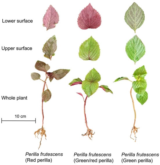 Perilla frutescens (L.) Britt. is an annual, erect herbaceous plant of the genus Perilla in the Lamiaceae family, widely distributed across Asia. It has been traditionally employed in medicinal and culinary practices for centuries across China, Japan, Korea, and other Asian countries [1]. Leaf color is a critical attribute for consumer preference in P. frutescens [2]. The plant species P. frutescens exhibits three distinct chemotypes: green, bicolored (green/red), and red (purple), characterized by differential pigmentation patterns during leaf and stem development [3,4]. Red perilla manifests uniform anthocyanin expression across both adaxial (upper) and abaxial (lower) leaf surfaces, presenting as dark erythroid pigmentation, while the bicolored phenotype displays this chromatic characteristic exclusively on the abaxial surface (Figure 1). The purple and green/purple P. frutescens leaves are considered medicinal, while the green leaves are considered edible [5]. As both a medicinal plant and an industrial crop, P. frutescens is extensively employed in the food, pharmaceutical, and cosmetic industries, largely due to its distinctive aromatic compounds [6].