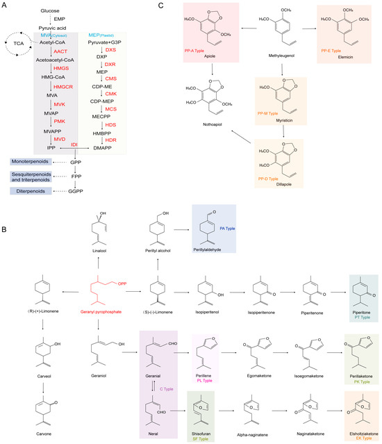 Figure 2. (A) Perilla frutescens terpene synthesis pathway; (B,C) P. frutescens chemotype. EMP, glycolytic pathway; TCA, tricarboxylic acid cycle; AACT, acetyl-CoA acetyltransferase; HMGS, hydroxymethylglutaryl-CoA; HMGCR, hydroxymethylglutaryl-CoA reductase synthase; MVK, mevalonate kinase; PMK, phosphomevalonate kinase; MVD, mevalonate diphosphate decarboxylase; DXS, 1-deoxy-D-xylulose-5-phosphate synthase; DXR, 1-deoxy-D-xylulose-5-phosphate reductoisomerase; CMS, 2-C-methyl-D-erythritol 4-phosphate cytidylyltransferase; CMK, 4-diphosphocytidyl-2-C-methyl-D-erythritol kinase; MCS, 2-C-methyl-D-erythritol 2,4-cyclodiphosphate synthase; HDS, 4-hydroxy-3-methylbut-2-enyl diphosphate synthase; HDR, 4-hydroxy-3-methylbut-2-enyl diphosphate reductase; IDI, isopentenyl pyrophosphate isomerase; IPP, isopentenyl pyrophosphate; DMAPP, dimethylallyl pyrophosphate; GPP, geranyl pyrophosphate; FPP, farnesyl pyrophosphate; GGPP, geranylgeranyl pyrophosphate.