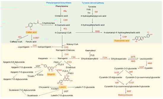 Figure 3. Synthesis pathway of Perilla frutescens flavonoids and phenolic acids. PAL, phenylalanine ammonia lyase; C4H, cinnamate 4-hydroxylase; 4CL, 4-coumarate-CoA ligase; COMT, caffeic acid 3-O-methyltransferases; CHS, chalcone synthase; CHI, chalcone isomerase; F3H, flavanone 3-hydroxylase; F3′H, flavonoid 3′-hydroxylase; FNSI, flavone synthasel, I; FLSII, flavone synthase II; UGT, UDP-glycosyltransferase; F3′5′H, flavonoid 3′,5′-Hydroxylase; TAT, tyrosine aminotransferase; RAS, rosmarinate synthase; CYP, cytochrome P450; DFR, dihydroflavonol reductase; ANS, anthocyanin synthase; 3-GT, flavonoid 3-O-glucosyltransferase; AAT, anthocyanin acyltransferase; 5-GT, anthocyanin 5-O-glucosyltransferase; MAT, Malonyl-CoA: anthocyanin malonyltransferase.