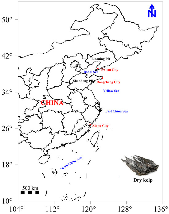 In 2023, it is estimated that China’s kelp production will surpass 1.78 million tons, with Fujian, Liaoning, and Shandong as the leading provinces for kelp aquaculture in the country [29]. These provinces have been designated as key monitoring regions. To ensure the authenticity of the samples, dried kelp (Laminaria japonica) was collected directly from different production enterprises in Dalian City (n = 30) in Liaoning Province, Rongcheng City (n = 30) in Shandong Province, and Xiapu City (n = 30) in Fujian Province in 2024 (Figure 1). For each batch of samples, 1 kg of dried kelp was carefully collected, placed in food-grade plastic bags, and sealed before transportation to the laboratory. All fresh kelp used for dried kelp production was sourced from coastal aquaculture farms near the production enterprises.