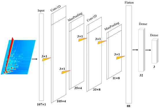 One-dimensional convolutional neural networks (1D-CNNs) share similarities with their two-dimensional counterparts (2D-CNNs) in that both utilize convolutional operations to extract features from input data. However, 1D-CNNs are particularly well suited for processing one-dimensional signals, such as spectral data. This advantage is especially pronounced when the available training data are limited or when the application is highly specialized, as 1D-CNNs can effectively capture relevant features and patterns within such data [21,22]. In this research, a 1D-CNN model was formulated to ascertain the geographical origin of kelp based on VOC data. The architecture of the 1D-CNN is depicted in Figure 2. More precisely, the 1D-CNN architecture features two convolutional layers, two max pooling layers, one flattened layer, and two dense layers. The input layer receives processed VOC data in a (107 × 1) format. During the convolution and max pooling operations, each convolutional kernel and max pooling filter retains dimensions of (3 × 1). The model employed a rectified linear unit (ReLU) activation function to introduce nonlinearity, thereby reducing computational complexity and alleviating the “dying ReLU” issue, which can impede the convergence of machine learning models during training [18,35]. The flattening layer converts the extracted and pooled VOC features into an 88-element one-dimensional vector, which is subsequently fed into a fully connected dense layer containing 32 neurons. At the network’s output, a softmax activation function is employed in the fully connected layer to assign sample labels by evaluating the predicted probabilities.