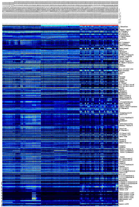 The VOCs present in kelp sourced from three cities were analyzed using GC-IMS. The abscissa represents the relative ion drift time (Dt), whereas retention time is plotted along the ordinate. The crimson reference marker positioned at x = 1.0 delineates reactive ion peak (RIP) baselines, while a chromatic gradient correlates with VOC signal magnitudes through an intensity-dependent colorimetric scale (blue < red progression) [39]. Our analysis demonstrates predominant spectral features are confined to retention time (100–1100 s) and drift time (Dt 1.0–1.8 ms) operational windows, while co-detected analyte signatures exhibit temporal synchronization across both separation dimensions (Figure 3, upper panel). This observation underscores the variations in properties including volatility, polarity, molecular weight, and charge state of the VOCs [40].