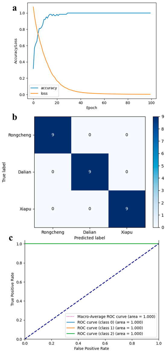 The 1D-CNN model was assessed using the test set assigned in the preceding section. The evaluation results revealed that the model achieved perfect performance, with discrimination accuracy, recall, and F1 score all reaching 100%. To further assess the 1D-CNN model’s performance and its ability to distinguish between geographical origins, we documented and visualized the training accuracy, cross-entropy loss, AUC, and confusion matrix for each origin in Figure 6. As depicted in Figure 6a, the training set’s accuracy improved with the increase in epochs, while the cross-entropy loss declined, demonstrating that the 1D-CNN model rapidly converged within 100 epochs. As illustrated in Figure 6b, the confusion matrix reveals that all 27 test set samples were accurately classified. Additionally, the diagnostic ability of the 1D-CNN model was evaluated using the ROC curve presented in Figure 6c, with the AUC for samples from all three cities reaching 1.00. Furthermore, the proposed 1D-CNN model exhibits lower computational complexity, with FLOPs totaling only 16.1 K and model parameters comprising just 3.1 K, making it easy to reproduce elsewhere. Compared to the predictive accuracy of 95.8% achieved by earlier studies using fatty acid fingerprinting technology to trace the origin of kelp, our method achieves an accuracy of 100% [48]. Consequently, the 1D-CNN model developed in this study is highly effective in identifying the origin of kelp. In summary, the model presents remarkable precision, swift convergence, and robust generalization in determining the geographical origins of kelp from major cities in China.