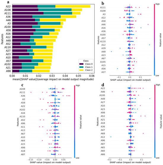 The SHAP toolkit was applied to the trained 1D-CNN model, generating a matrix of SHAP values. To pinpoint the most influential features for the 1D-CNN model, we computed the mean absolute SHAP values for each feature and generated a stacked bar plot, with different geographical origins represented by distinct colors (Figure 7a). In this plot, the top 20 features were ranked according to the absolute sum of their impacts on the model. Notably, the features A22 (1-Octen-3-ol-M), A108 ((+)-limonene), A111 (allyl sulfide-D), A36 (1-hydroxy-2-propanone-D), and A46 ((E)-2-hexen-1-al-M) were identified as the top five features influencing the model output. Among these, feature A22 (1-Octen-3-ol-M) exhibited a dominant position, accounting for nearly 50% of the variance. This finding suggests that the concentration of A22 (1-Octen-3-ol-M) is the most crucial factor in the 1D-CNN model’s classification of kelp origin, particularly for Xiapu kelp.