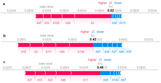 Interpretation of individual instances was executed with a SHAP force diagram (Figure 8), which displays samples drawn from the actual estimation outcomes for each city. In the graph, the baseline value signifies the mean model estimation results derived from the training dataset. When the model’s output lies to the right of the baseline value, the sample is categorized as belonging to the selected city; in contrast, if it lies to the left, the sample is not categorized as belonging to that city. This study focuses exclusively on the top five features that significantly influence the model output. The outputs of the model for three instances are shown to be positioned to the right of the base value, implying that these samples pertain to the selected city. However, the significance of each feature varies across different instances. In the case of Rongcheng, the base value is 0.3334, while the selected samples display a relatively higher prediction of 0.52 compared to the actual label of 0. This illustrates how certain values of A30 (allyl isothiocyanate-M) and A113 (1-propanol, 2-methyl) are associated with negative SHAP values, which consequently diminish the likelihood of samples belonging to Rongcheng. In contrast, the values of A3 (1), A34 (6), A108 ((+)-limonene), A47 ((E)-2-hexen-1-al-D), and A33 (5) are linked to positive SHAP values, thus increasing the probability that samples belong to Rongcheng (Figure 8a). For the Dalian cases, the values of A108 ((+)-limonene), A58 (11), A111 (allyl sulfide-D), A3 (1), and A10 (2) are associated with positive SHAP values (Figure 8b), while A87 (methyl propanoate), A38 (1-octanal-M), A37 (2-butanone, 3-hydroxy-M), A88 (acetic acid propyl ester), and A76 (1-hexanal) exert a negative influence on the Dalian cases (Figure 8b). The selected samples have a notably higher predicted value of 0.48 for Xiapu, with A11 (1-butanoic acid), A48 (8), A22 (1-octen-3-ol-M), A12 (propanoic acid-D), and A21 (acetic acid) related to positive SHAP values (Figure 8c). In summary, the tendency observed in the interpretation of local features is in parallel with that of global features.