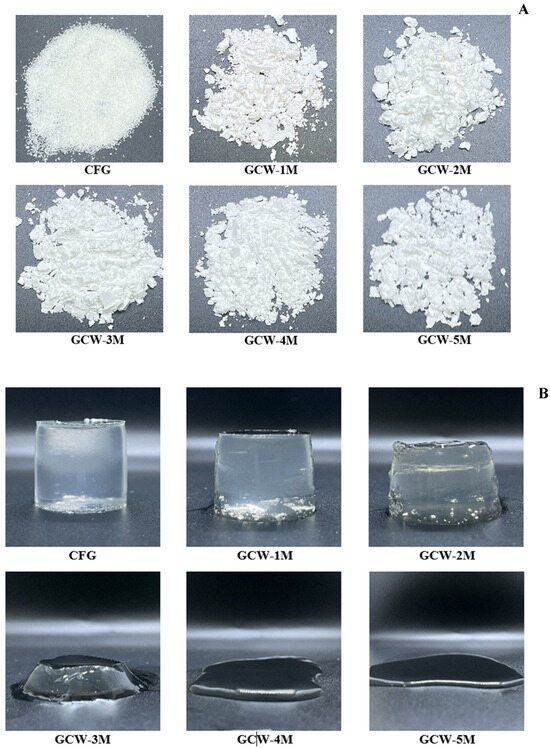 Hygroscopicity was determined according to Kou, et al. [23]. A GCWP sample (1 g) was placed in a desiccator, with the relative humidity controlled at 75.29% using a saturated sodium chloride solution. Each sample was accurately weighed every hour, with the hygroscopicity determined as grams of absorbed moisture per 100 g of dry matter (g/100 g). Further syneresis was calculated based on a modification of the method of [24]. The gelatin solutions (6.67%) were prepared by dissolving the various GCWP preparations in distilled water at 60–70 °C. Each gelatin solution (30 mL) was poured into 50 mL centrifuge tubes and the mass (m1) was recorded, followed by chilling at 4 °C for 18 h. Before remeasurement, each sample was equilibrated at room temperature for 3 h. Next, it was centrifuged at 4 °C, at a speed of 5000 rpm, for 10 min, using a refrigerated centrifuge (UNIVERSAL 32R; Hettich; Kirchlengern, Germany). After centrifugation, the water on top of the solution was wiped off, and care was taken not to touch the solution. The tube was weighed (m2). The syneresis was calculated using the following equation: