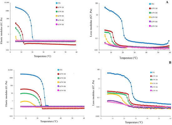 Elastic modulus (G′) and loss modulus (G″) of 6.67% gelatin capsule waste powder containing different amounts of maltodextrin during cooling from 60 °C to 5 °C (A) and from 5 °C to 60 °C (B).