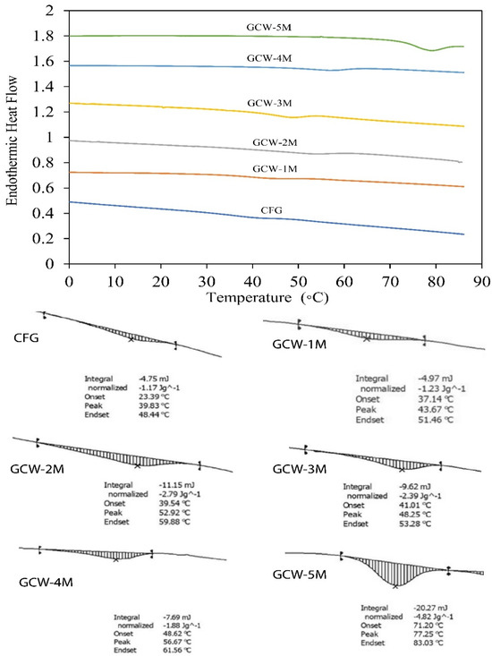 The DSC thermograms of the GCWP samples containing different amounts of maltodextrin are shown in Figure 3. The Tg value denotes the temperature at which the material transitions from an amorphous state to a rubbery and viscous state [64]. Furthermore, the Tg value of spray-dried powder serves as a key indicator of its stability during extended storage, as it is widely recognized that maintaining spray-dried products below their glass transition temperature enhances stability [65]. In the current study, the Tg value of the control gelatin (CFG) was 23.39 °C. Notably, as the maltodextrin ratio increased, the Tg of all the treatment samples gradually increased. The shift of the Tg peaks to higher values in the treatments indicated an interaction between maltodextrin and the GCW, resulting in changes in physical properties. In general, Tg is influenced by factors such as the material’s moisture content, chemical composition, and molecular weight [65]. Stępień and Witczak [66] reported that the addition of maltodextrin contributed to an increase in the Tg value of green pea (Pisum sativum L.) powder. Thus, the DSC analysis demonstrated that the thermal behavior of gelatin can be greatly modified by the addition of maltodextrin.