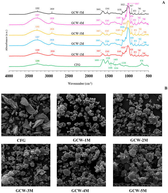 (A) FTIR spectra and (B) microstructure images of gelatin capsule waste powder with varying amounts of maltodextrin. Remark: The magnification for the control sample was 500×, whereas for the treatment samples, it was 1000×. The control sample was presented at 500× because, at 1000× magnification, the overall shape of the powder crystals was not clearly visible due to their larger size.