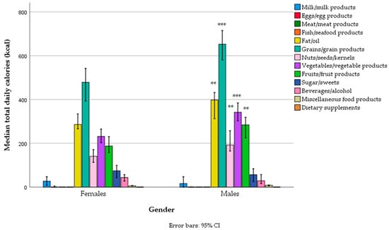 Total daily energy intake from different food groups across gender categories in a sample of vegetarians/semi-vegetarians 18–74 years old (n = 314) living in Serbia (** p < 0.01, *** p < 0.001).