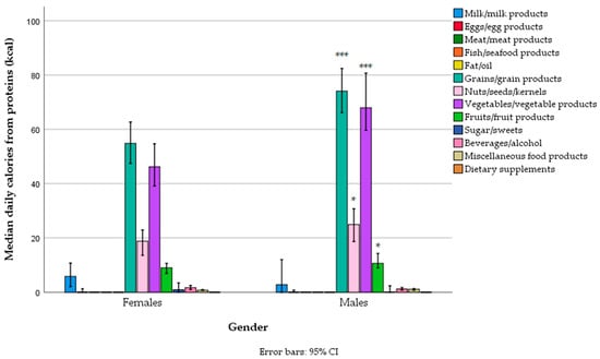Protein-related energy intake from different food groups across gender categories in a sample of vegetarians/semi-vegetarians 18–74 years old (n = 314) living in Serbia (* p < 0.05, *** p < 0.001).